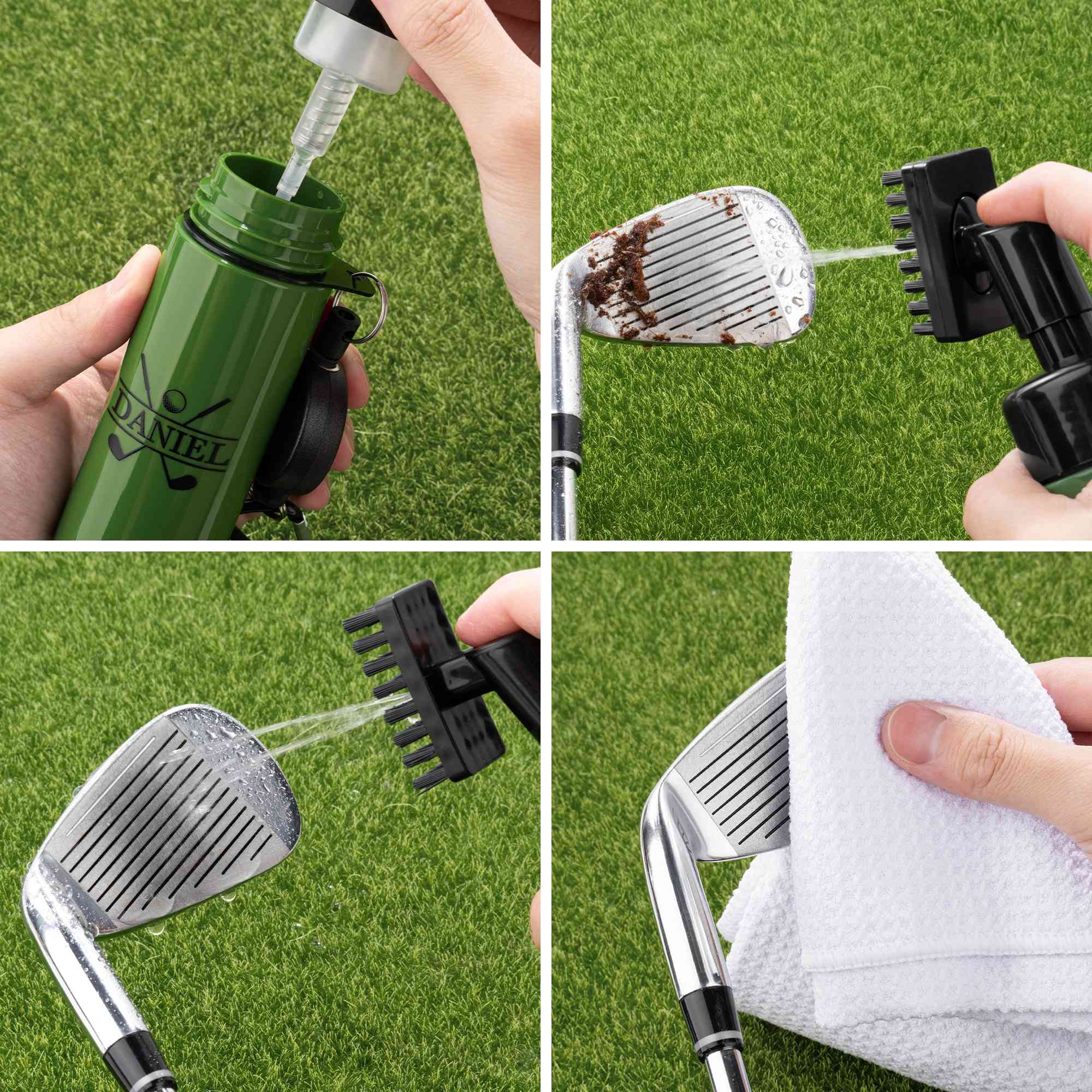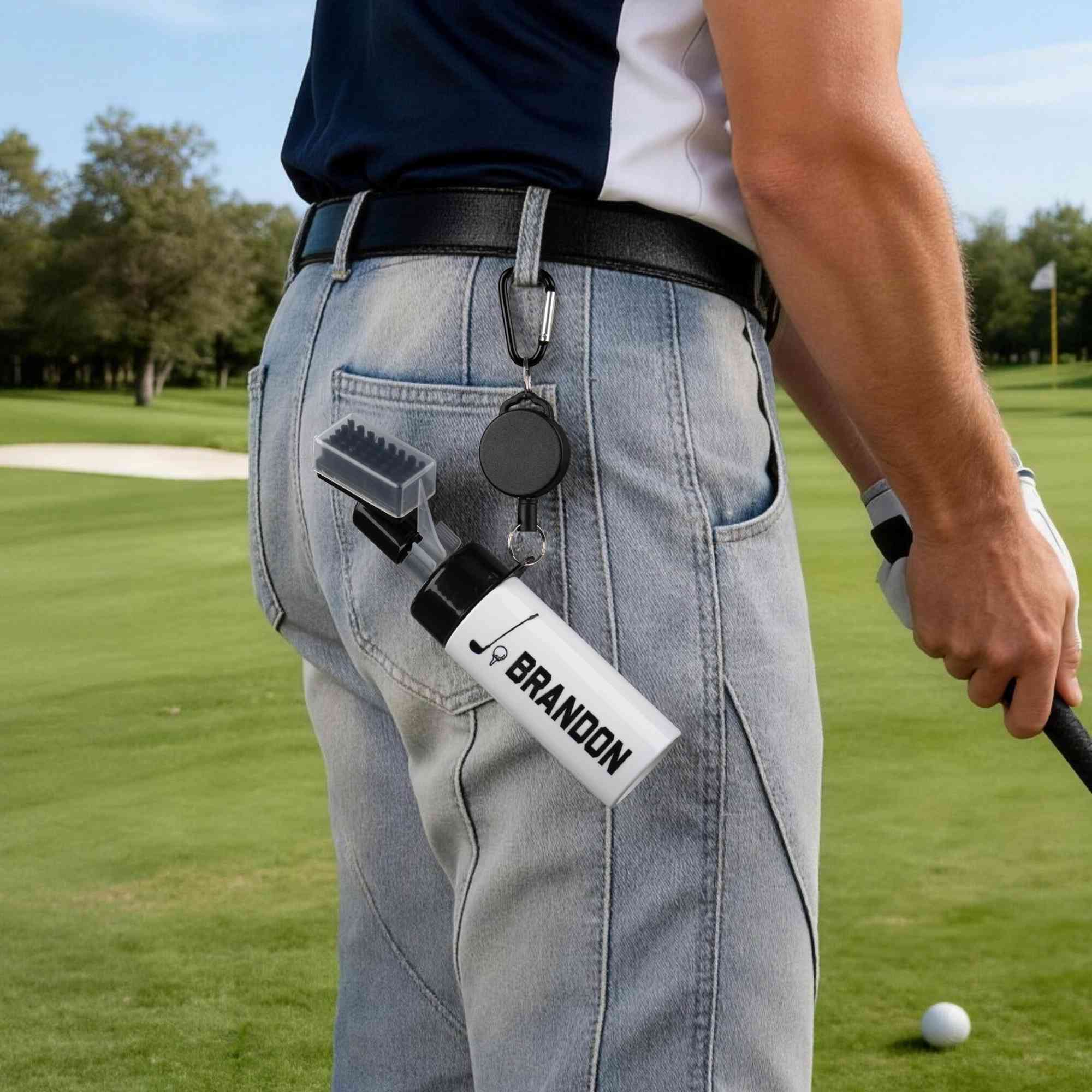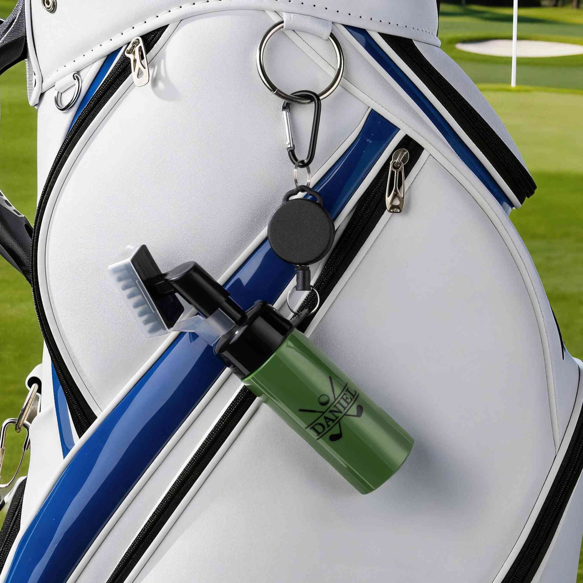 Practical Use - Combining a water spray function with a cleaning brush, this accessory offers convenient club maintenance on the go. The one-touch spray helps rinse away dirt, while the brush head cleans grooves thoroughly for improved club performance. Complete with a portable hanging buckle, it can be easily attached to a golf bag or belt for quick access during every game.