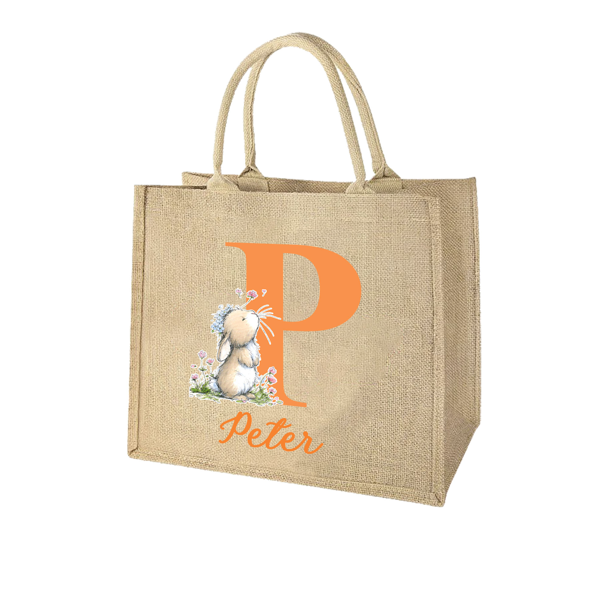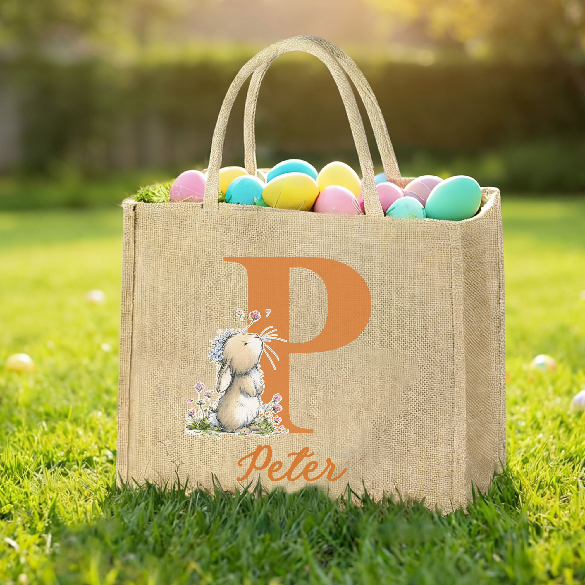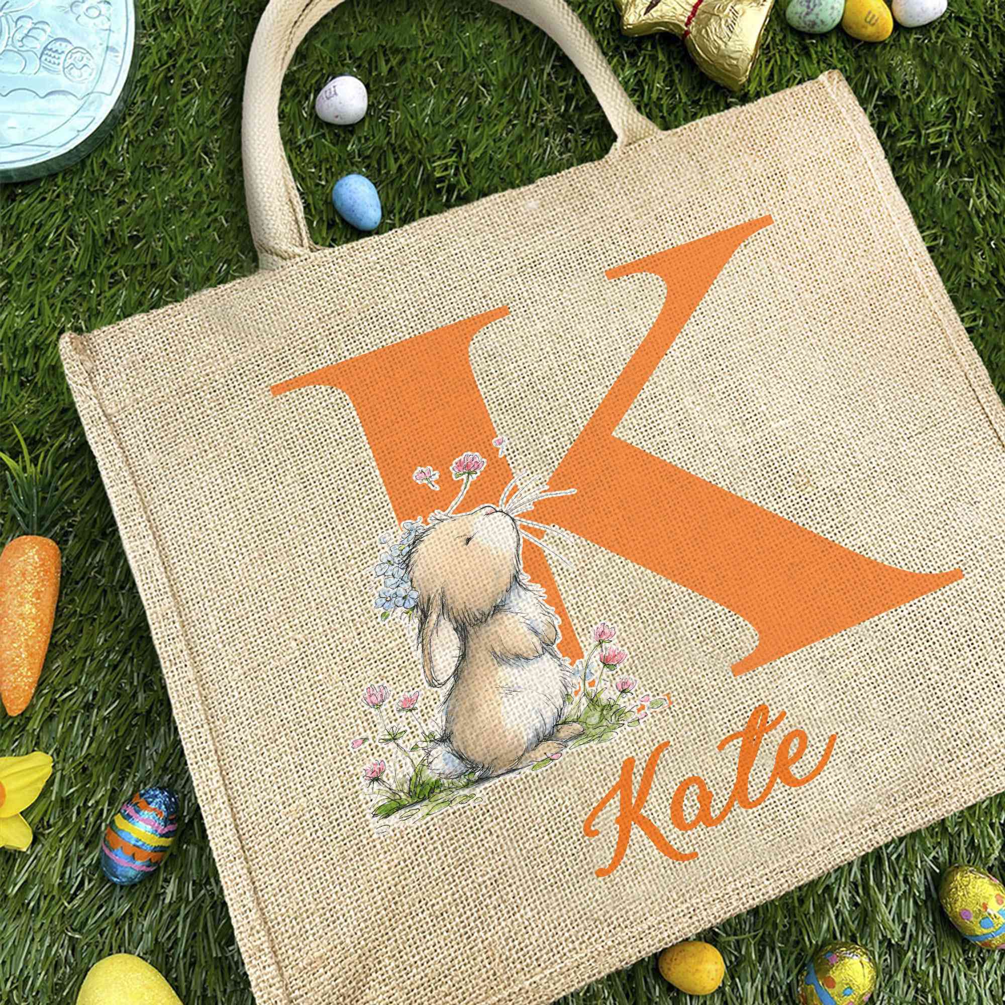 Floral Bunny Alphabet Design - This tote bag features a charming floral bunny paired with an alphabet letter and personalized name. The playful rabbit design captures the joy of Easter while the delicate flowers add a sweet and stylish touch. It feels festive yet timeless, perfect for children and women who love a cute seasonal look.