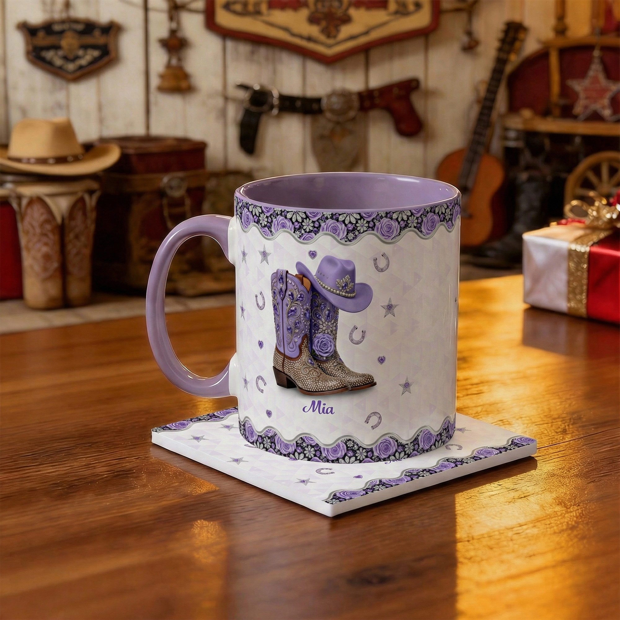 Western Glam Design - This mug features a sparkling cowgirl hat and cowboy boots decorated with rhinestone-style details and soft floral accents. The western theme brings a fun and stylish country vibe that stands out on any table. Paired with a matching coaster, the design celebrates the spirit of cowgirls and horse lovers in a charming and eye-catching way.