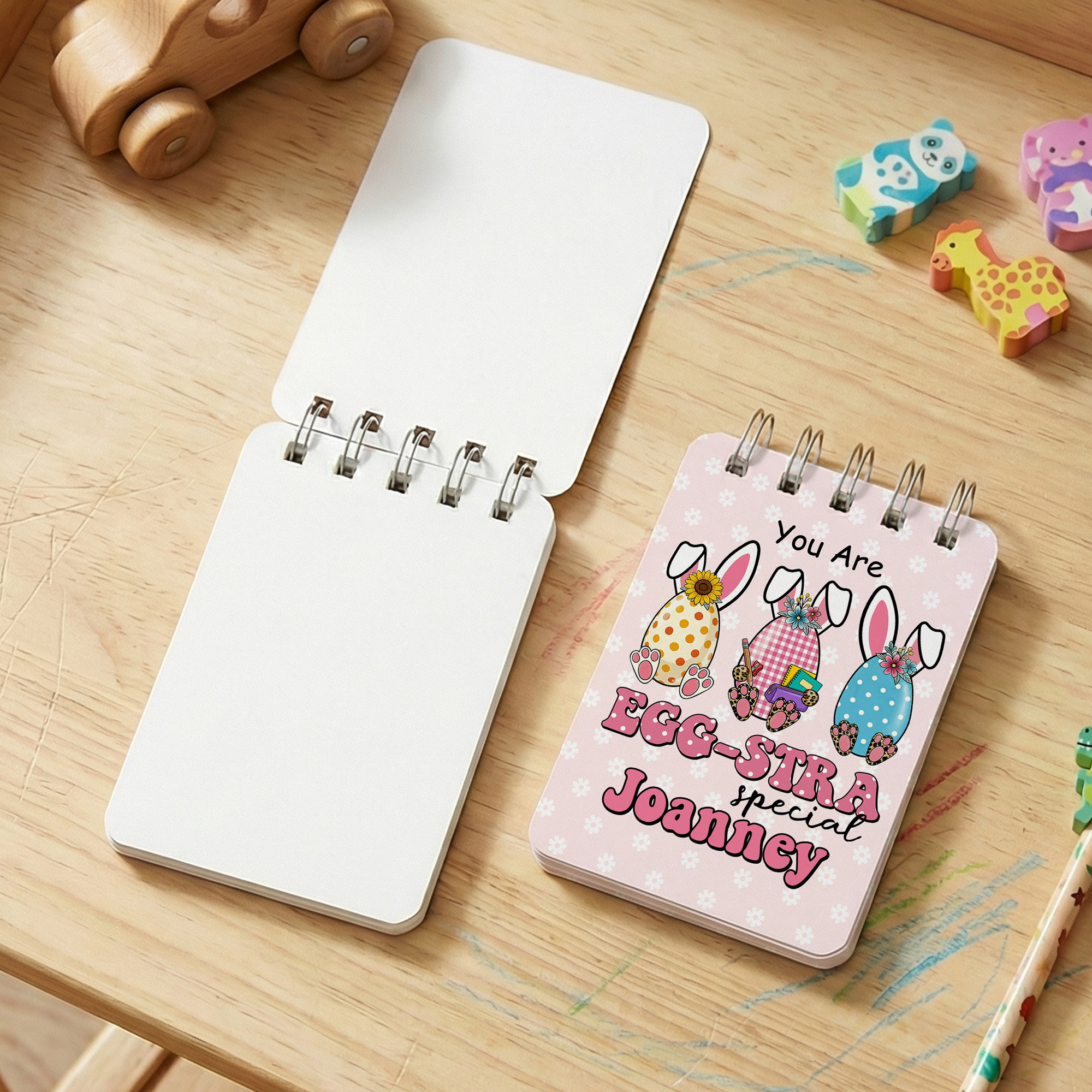Sweet Bunny Eggs Design - This notebook features three colorful Easter bunny eggs and the cheerful phrase “You Are Egg-Stra Special.” The bright, cute design captures the fun spirit of Easter and adds a joyful touch to everyday notes. Its charming style appeals to kids and brings a little seasonal happiness to school or home activities.