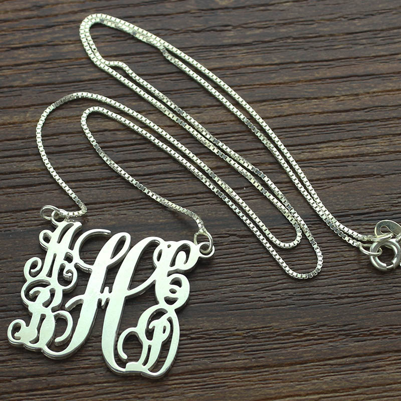 1. A monogram necklace is typically structured with the last name as the large initial in the center, first name initial on the left, and middle name initial on the right.