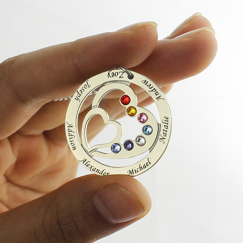 This beautiful heart necklace with birthstones can be engraved with up to seven names and feature up to seven birthstones. Commemorate the children in your family with this gorgeous mom necklace.