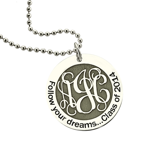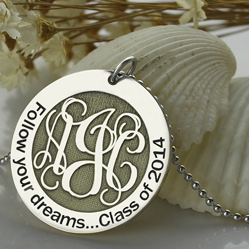 1. A monogram necklace is typically structured with the last name as the large initial in the center, first name initial on the left, and middle name initial on the right.