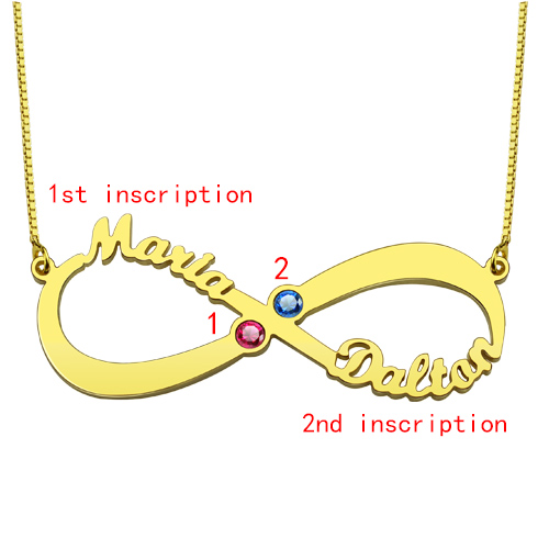 Be the envy of everyone you meet as you declare your forever love for all to see with the incomparable Infinity Name Necklace with Birthstones.Honor your infinite love with this stylish couple's necklace.This sterling silver necklace hangs from a box chain and can be set with two names of your choice to be set on either side of the infinity symbol.