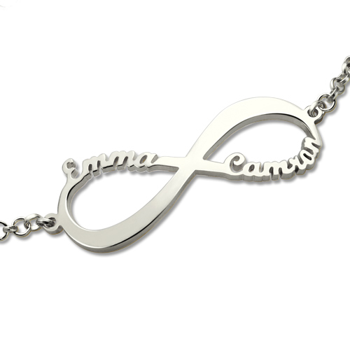 Everyone loves the infinity symbol around your neck or wrist, but this sterling beauty takes things to the next level.Two name on each side of infinity for a truly meaningful gift.