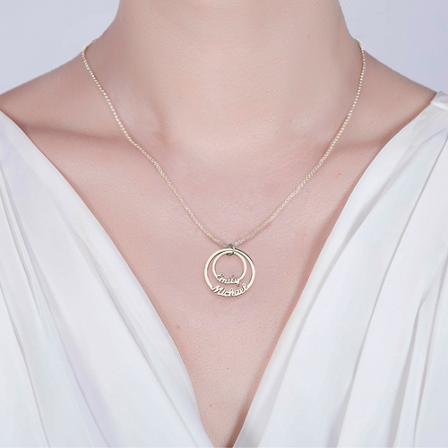 Show your commitment to each other with our Two Disc Name Necklace . The two circles give the appearance of eternity bands and represent a promise of love.One name on each of the two circles for a personalized touch that means even more.