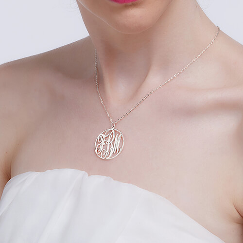 1. A monogram necklace is typically structured with the last name as the large initial in the center, first name initial on the left, and middle name initial on the right.